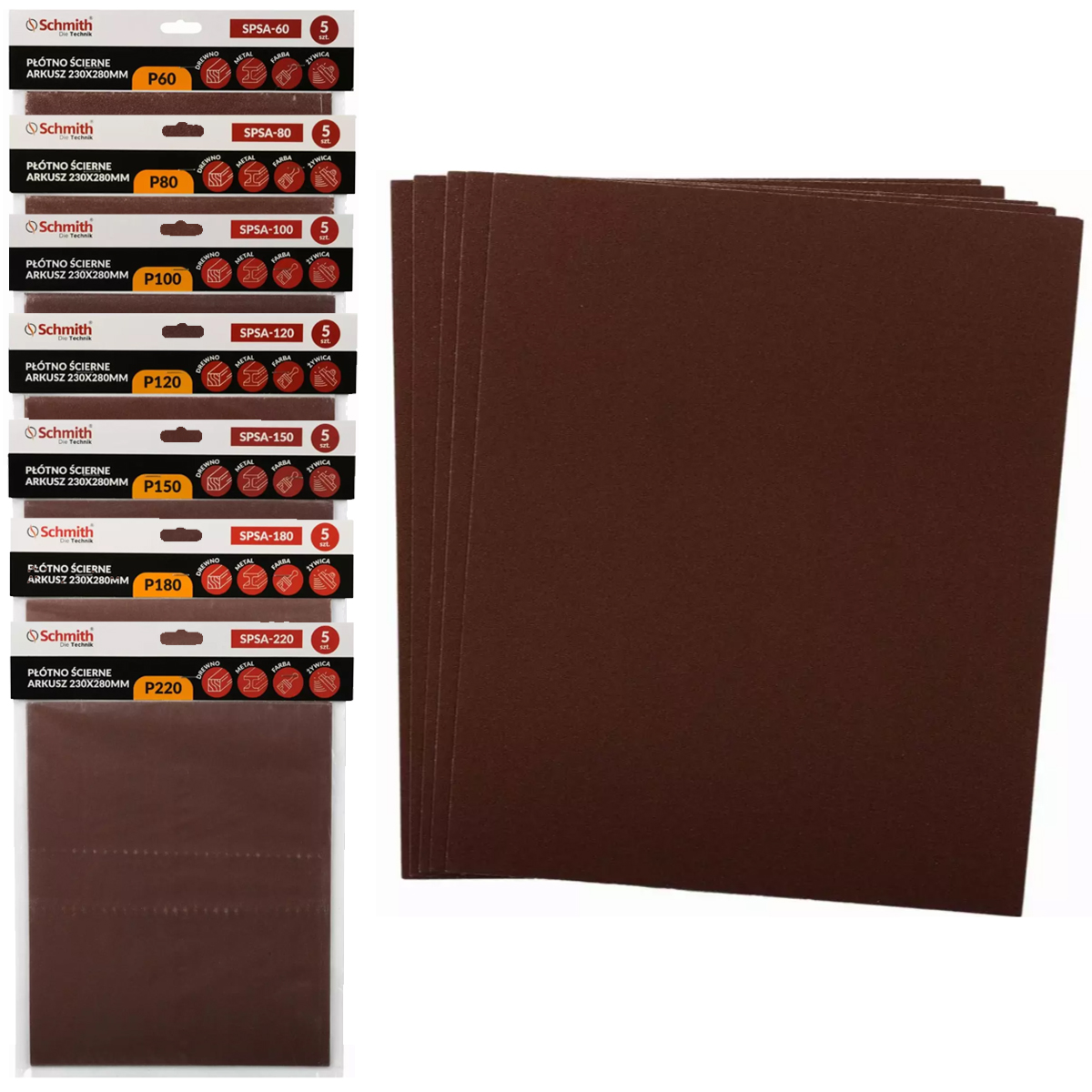 Komplet płócień ściernych w arkuszach 230x280 mm, przeznaczonych do szlifowania ręcznego lub przy pomocy elektronarzędzi, materiałów takich jak drewno, stal, żeliwo, tworzywa sztuczne, lakiery, bejce, farby, parkiety itd.