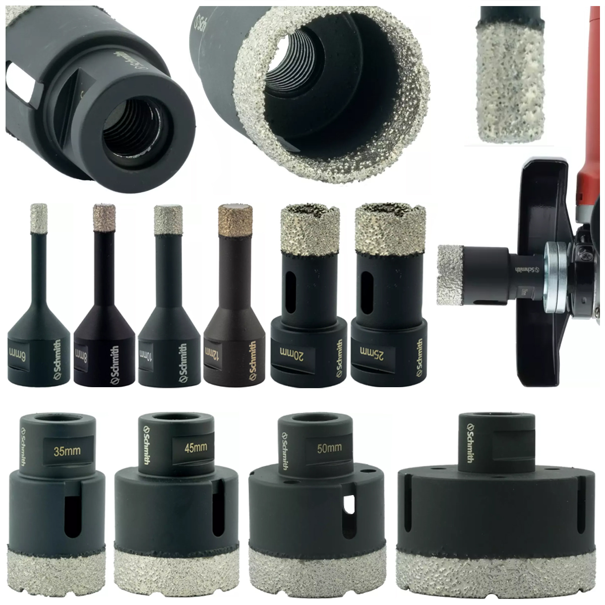 Zestaw otwornic diamentowych z mocowaniem M14, przeznaczonych do pracy na sucho i wiercenia w twardych i trudnych materiałach, takich jak gres, glazura, granit, marmur, beton czy ceramika. Otwornice doskonale współpracują ze szlifierkami kątowymi. Wyposażone są w nasyp diamentowy, który umożliwia szybkie i łatwie wiercenie.