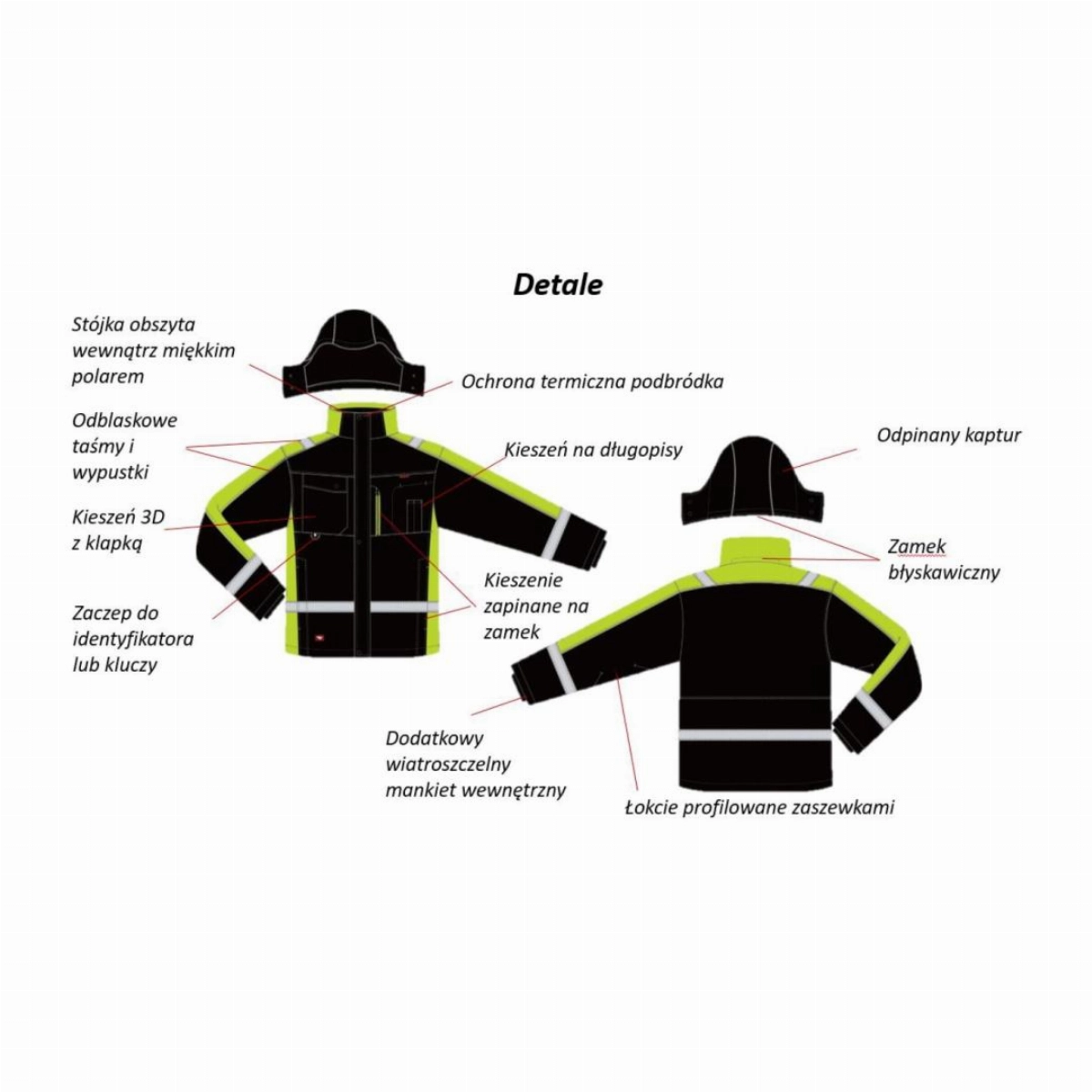 Wodoodporna, oddychająca i wiatroszczelna kurtka zimowa to doskonałe rozwiązanie dla osób pracujących w trudnych warunkach atmosferycznych. Dzięki podklejanym szwom i powłoce PU, kurtka zapewnia nieprzemakalność i skuteczną ochronę przed wilgocią. Odpinany kaptur z regulacją oraz polarowy wewnętrzny kołnierz gwarantują ciepło i komfort użytkowania. Ergonomiczny krój rękawów oraz elastyczne mankiety zapewniają swobodę ruchów, a dolna regulacja obwodu kurtki umożliwia idealne dopasowanie do sylwetki. Kurtka wyposażona jest w aż 8 pojemnych kieszeni, w tym kieszenie na telefon, dokumenty oraz praktyczne kieszenie z siatki i zamkami błyskawicznymi, co czyni ją niezwykle funkcjonalną. Odblaskowe elementy zwiększają bezpieczeństwo użytkownika podczas pracy w słabym oświetleniu.