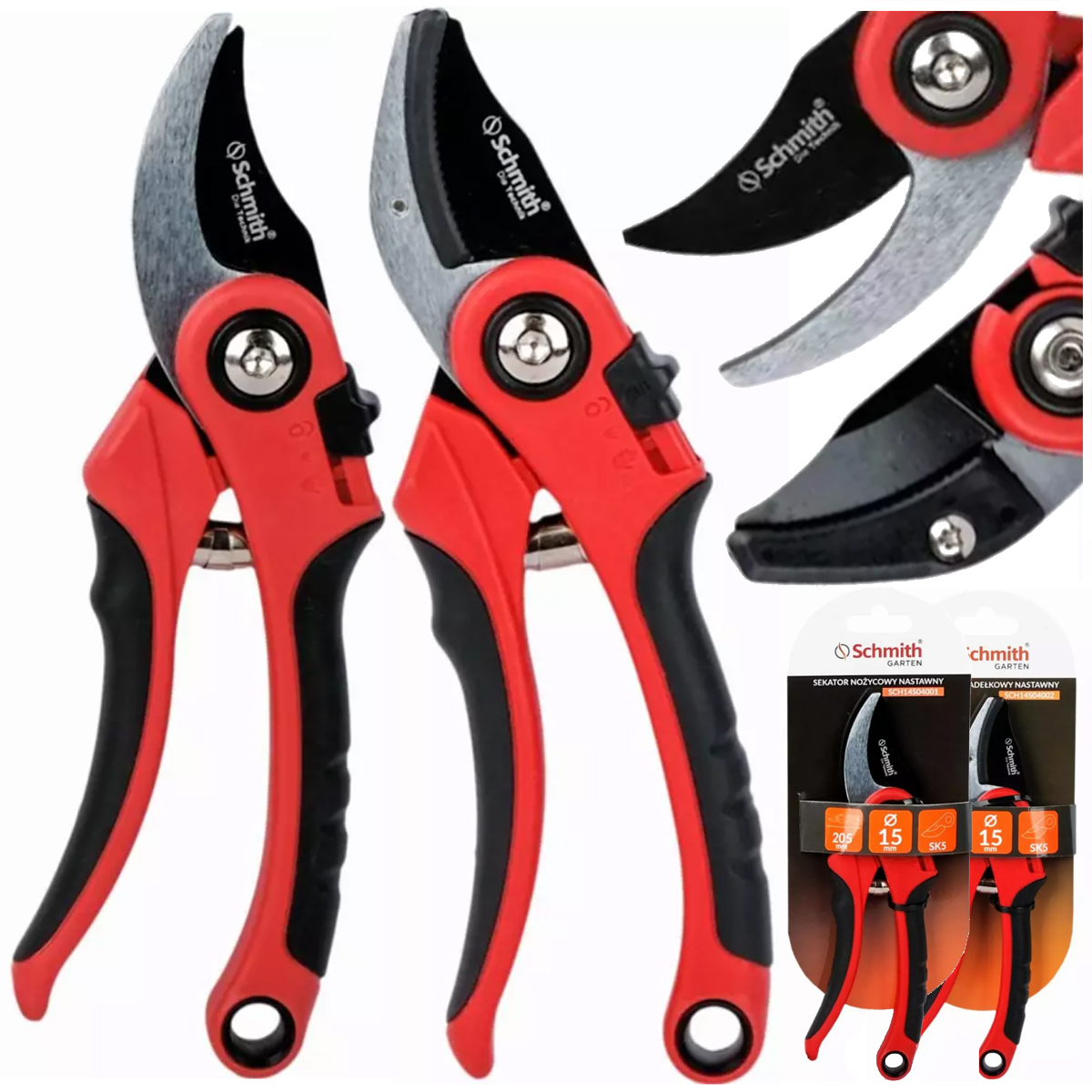 Komplet dwóch sekatorów, nożycowego do przycinania gałązek i zawiązów oraz kowadełkowego, do cięcia suchych i zdrewniałych gałęzi. Sekatory posiadają ostrza wykonane ze stali SK5, a także ergonomiczne rękojeści pokryte elastomerem.