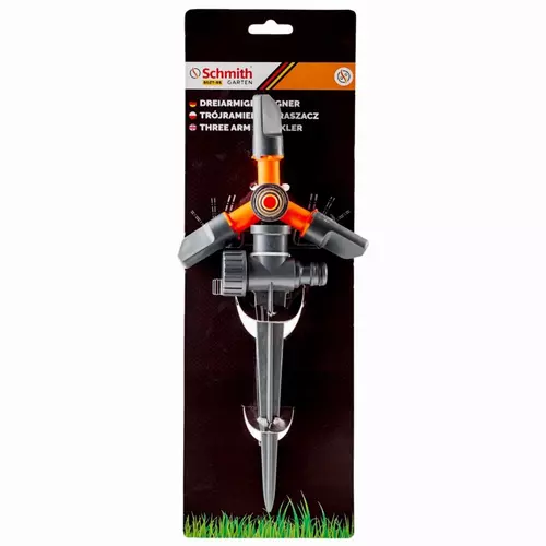 Trójramienny zraszacz ogrodowy do równomiernego nawadniania dużych powierzchni. Wykonany jest z wytrzymałego tworzywa sztucznego. Zraszacz wyposażony jest w wbijany kolec, umożliwiający pewne osadzenie go w ziemii. Urządzenie posiada nypel, umożliwiający szeregowe połączenie z innymi zraszaczami.