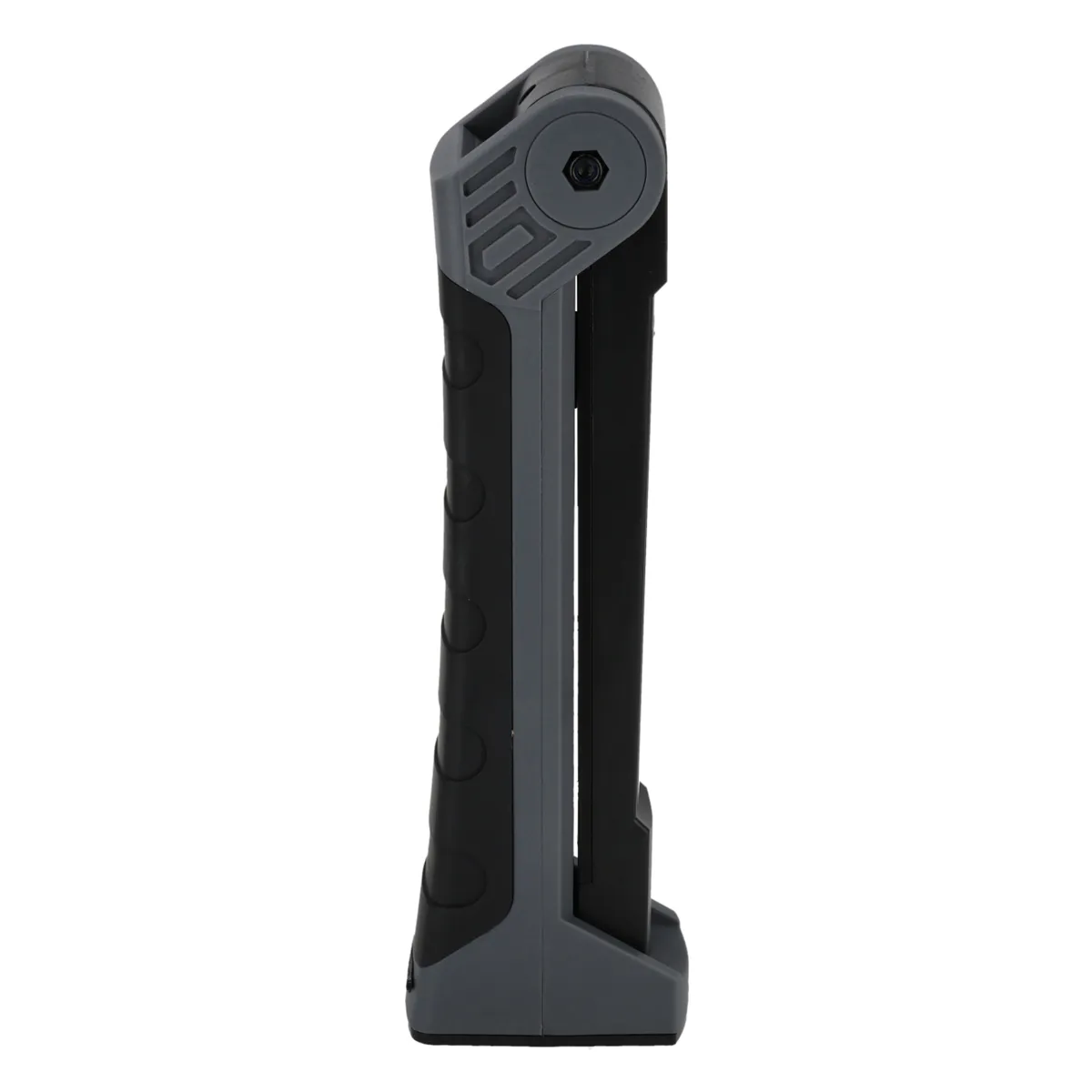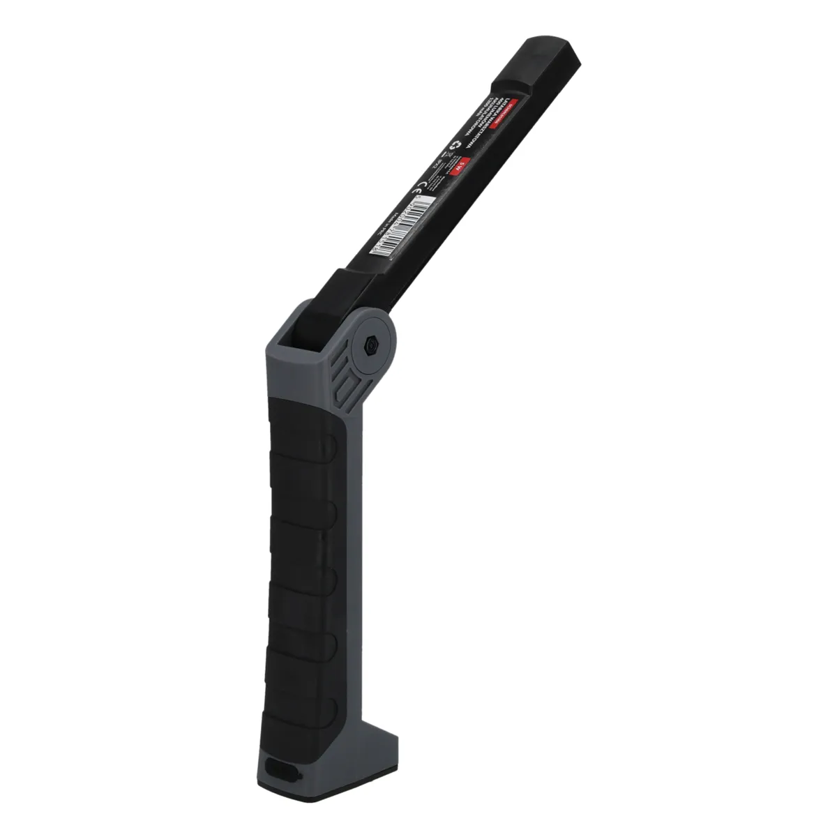 Składana latarka warsztatowa z dwoma źródłami światła. Wyposażona w magnes umieszczony na spodzie obudowy.