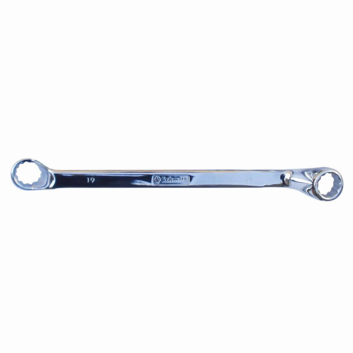 Klucz oczkowo-odgięty. Wykonany ze stali węglowej. Oczka klucza odgięte, co ułatwia pracę w trudno dostępnych miejscach.
