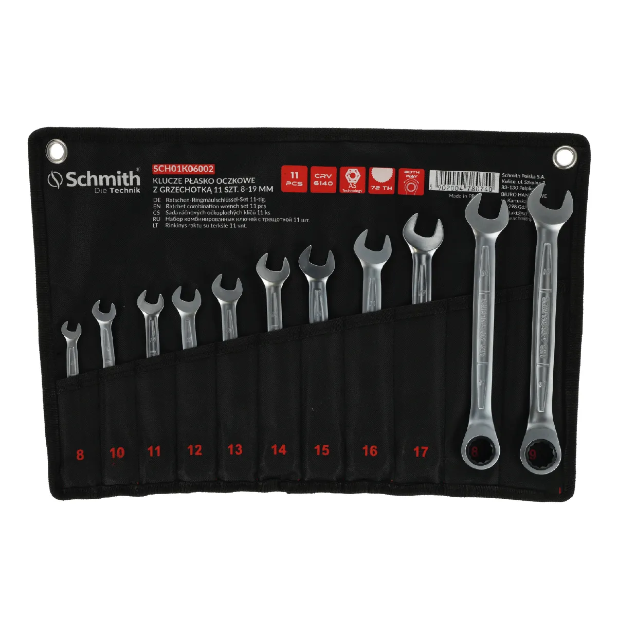 Komplet kluczy płasko-oczkowych z grzechotką i przegubem 8-19mm Schmith